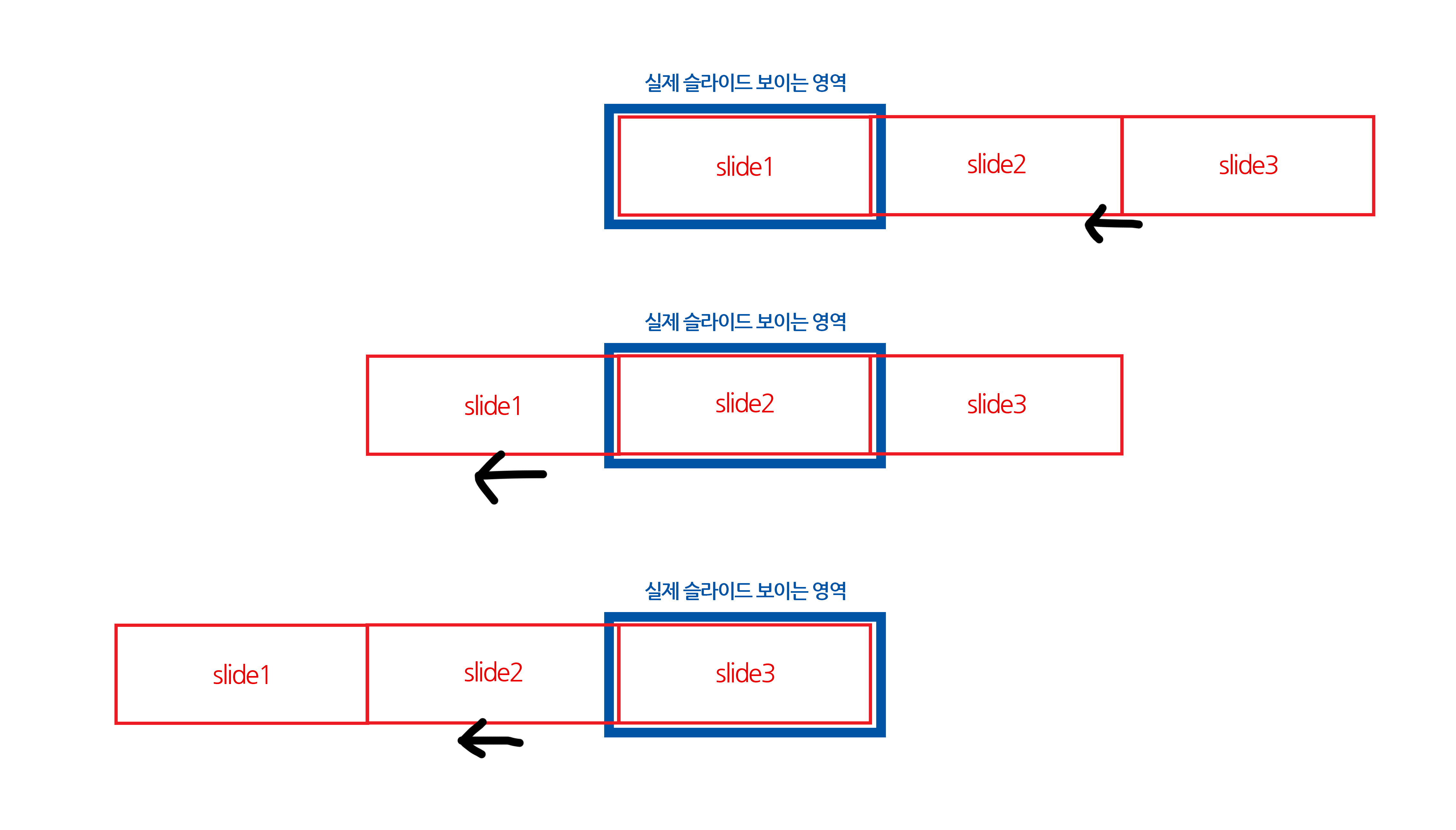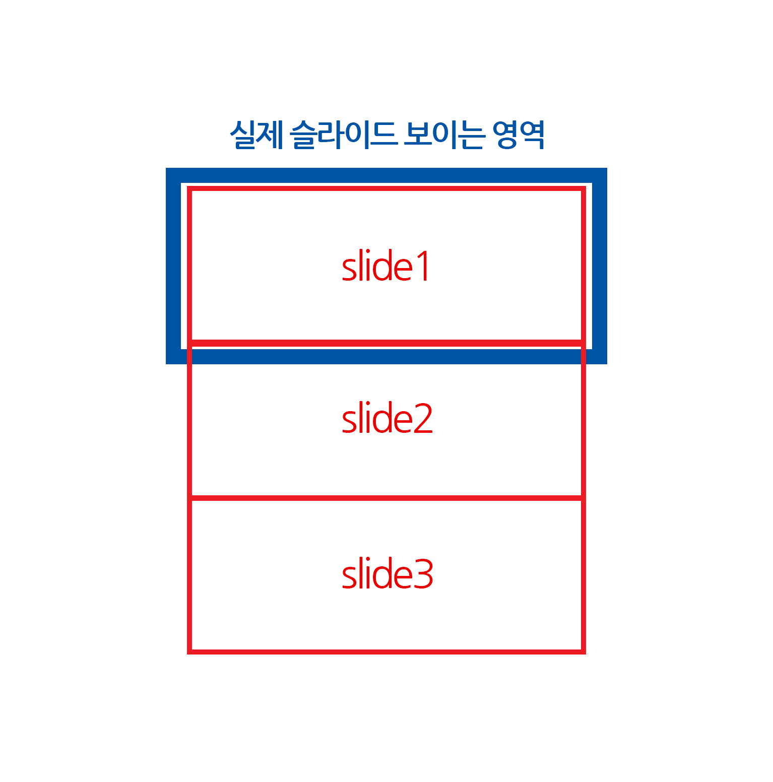 슬라이드는 실제 나열되어있는 다수의 슬라이드(빨강)과 다수의 슬라이드가 보이게 되는 영역(파랑)으로 구조가 나뉘어져 있습니다. 파랑 영역은 슬라이드 1개의 크기와 동일하게 설정하여 보이는 영역을 처리하고