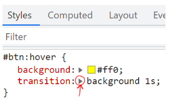 1. 트랜지션 속성을 개발자도구에서 띄우고 앞 삼각형을 클릭합니다.