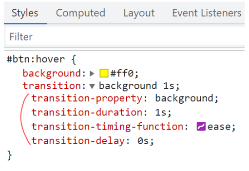 * transition에 적용가능한 속성들은 웹 브라우저 개발자도구(F12)를 통해서도 확인가능합니다.