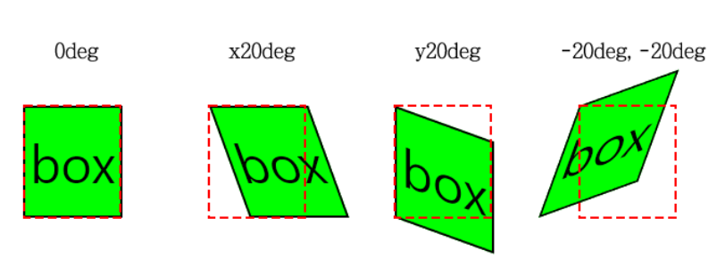 * (아래) 예시는 transform-orgin:left top 기준 skew 형태입니다.