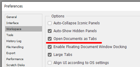 2. Workspace : Open Documents as Tabs 파일을 실행 시 탭 구조로 파일을 열 수 있습니다.