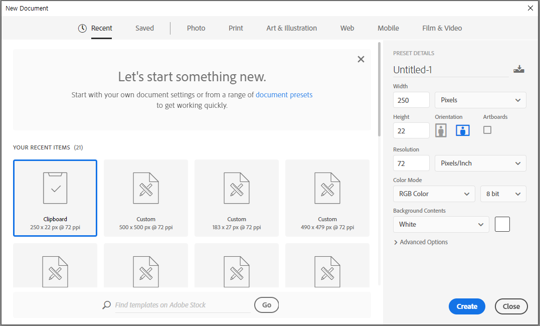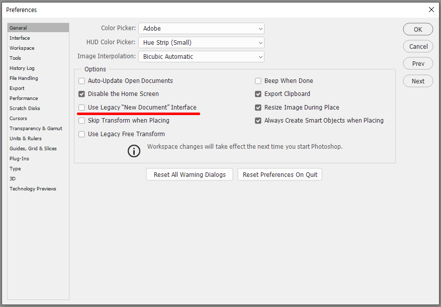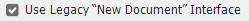 * General : Use Legacy "New Document" Interface 를 체크하면