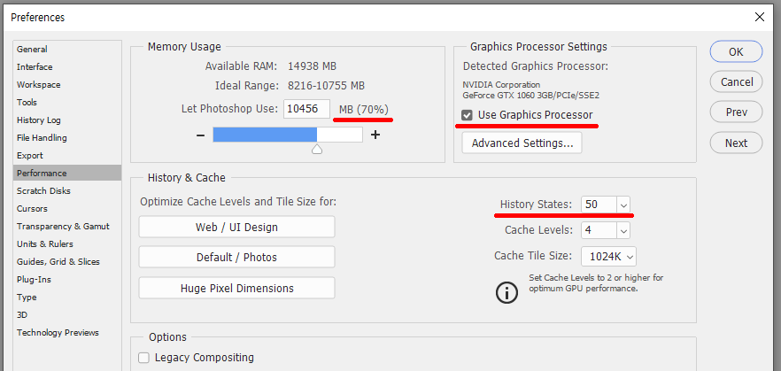 Graphics Processor Settings : Use Graphic Processor 그래픽 카드 기능을 포토샵에서 사용합니다.