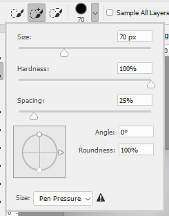 | (위)와 같은 모양으로 마우스 포인트가 보여야 합니다. 십자 모양만 표시 될 시 브러쉬 옵션의 크기정보를 확인하여 값이 너무 작거나 크지 않은 시 (0~10 또는 1000 단위 이상인지) 확인 하고 위 값이 정상이라면 키보드의 Caps Lock 키를 눌러서 아이콘을 변경합니다. |