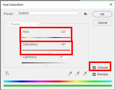 * 색상 보정은 Ctrl + U (Hue-saturation) 으로 처리합니다.