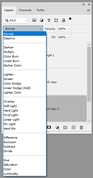 포토샵 레이어 블렌딩 모드 2개 이상의 레이어를 합성합니다. 1. Normal : 기본 설정 값 / dissolve(픽셀위치의 불투명도에 따라 임의로 기본색상이나 혼합 색상 대체) 2. Darken : 각 채널의 혼합색상