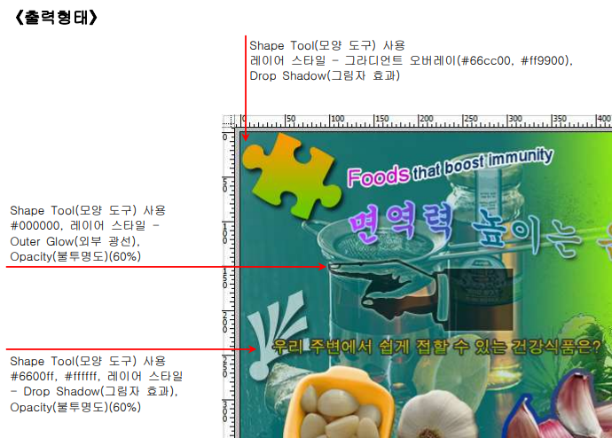 * 이 경우 주로 모양 도구와 레이어스타일로 기능들이 제공됩니다. 레이어의 투명도(Opacity)를 활용하는 경우도 있으니 주의하여 입력합니다.