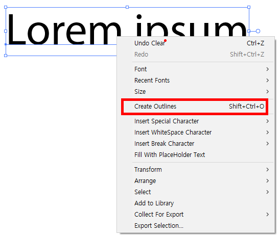 * create outlines 진행 후에는 문자 도구들을 활용한 글자 편집이 불가능해집니다.(패스편집만 가능)