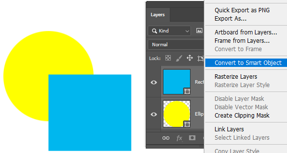 2. 레이어 2개를 함께 선택하고 레이어이름에서 우클릭 - Convert to Smart Object 클릭하면