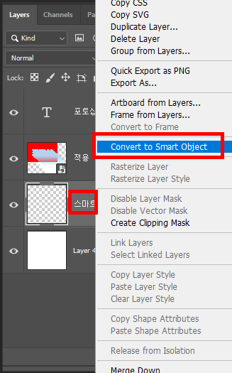 * 원하는 레이어 이름에서 마우스 오른쪽 클릭 Convert to smart Object 메뉴를 클릭하세요