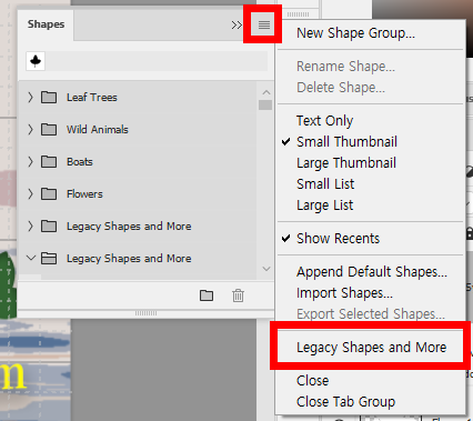 2. Shapes 우측 옵션 메뉴를 클릭하고 legacy Shapes and More 메뉴를 클릭하세요.