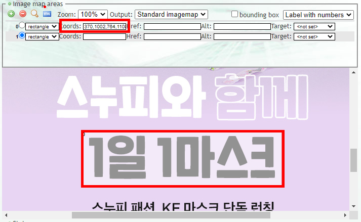 4-4. 선택하고자 하는 부분을 클릭 앤 드래그하여 그린 후 위 coords 값을 복사합니다.