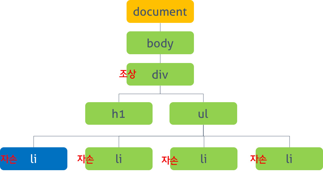 div - li라는 관계로 처리하면 조상 - 자손 관계가 됩니다.