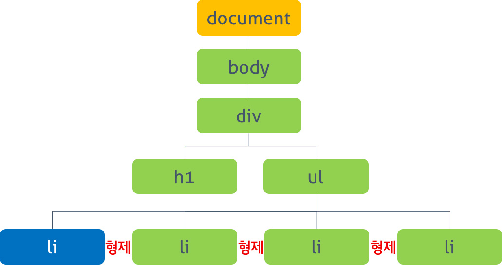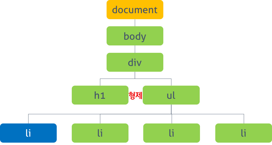 그러므로 ul은 h1 안이 아닌 바깥에 위치한 상태이므로 이 관계를 형제 관계라고 합니다.