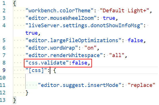 3. 기존 작성된 설정 사이에 "css.validate":false, 를 작성하세요.
