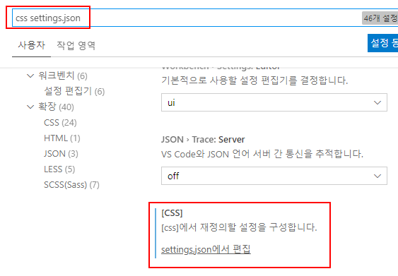 2. 상단 검색창에 css settings.json 을 작성하고 스크롤을 내려 아래 메뉴를 찾으세요.