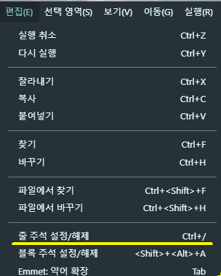 Vs code 편집메뉴에 Ctrl + / 라고 단축키가 작성되어있는데