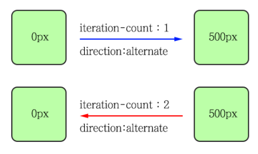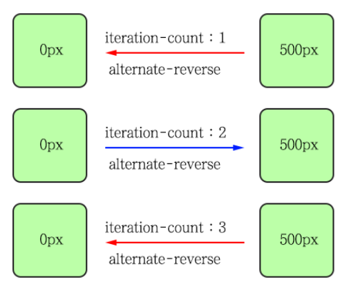 * 재생횟수 관계 없이 애니메이션 종료 위치는 @keyframes에 등록된 시작 위치로 이동합니다.