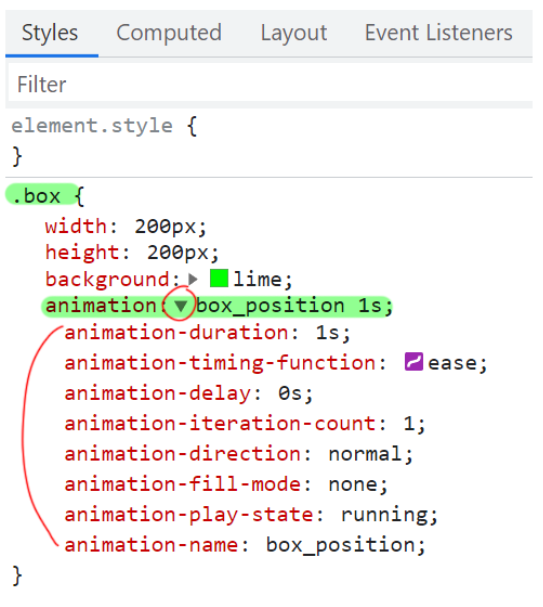 transition과 동일하게 개발자도구에서 애니메이션 속성 삼각형을 누르고