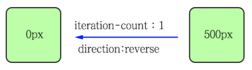 애니메이션 시작 위치는 0px 이며 도착(끝) 위치는 500px입니다.