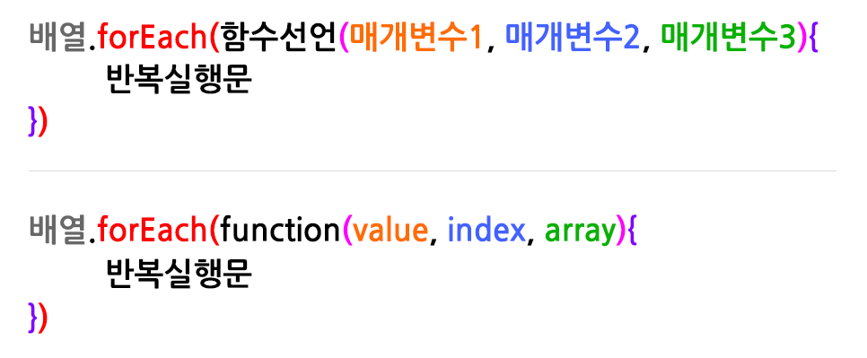 forEach() 메서드는 주어진 함수를 forEach 앞에 선언한 배열 요소에 각각 실행할 경우 사용합니다.