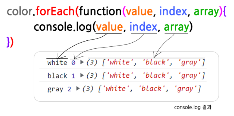 예1) color 배열을 선언하고 forEach()로 접근한다면?