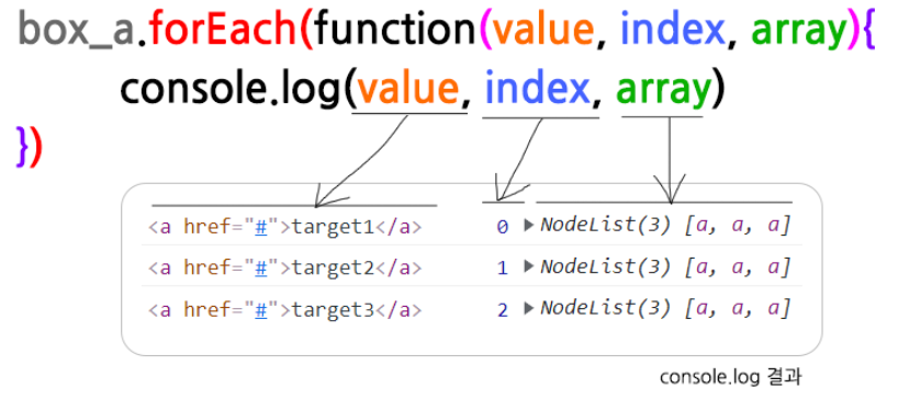 forEach() 메서드는 3개의 매개변수를 가집니다.