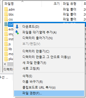 7. 생성된 data폴더에서 우클릭하여 파일 권한(권한 설정)으로 들어갑니다.
