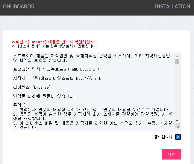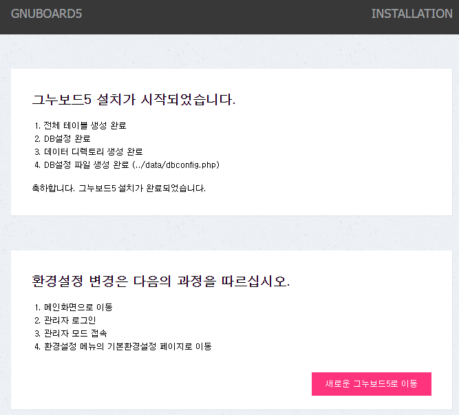 모든 설치가 완료되면 아래 새로운 그누보드로 이동 버튼을 누르세요.