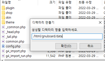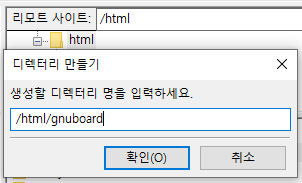 * 폴더명은 자유입니다. 알아보기 쉽도록 gnuboard라고 생성하세요. 뒤에 버전을 작성해도 됩니다.