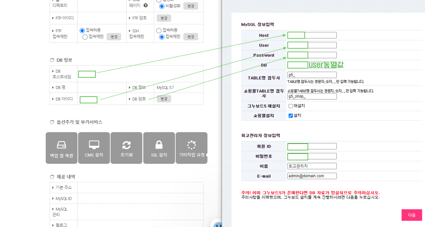 MYSQL 정보는 웹 FTP에 입력했던 FTP 사이트의 개인정보를 확인 후 정확하게 입력합니다.