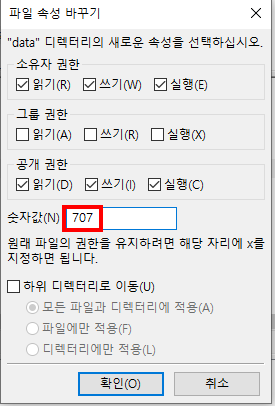 8. 권한창 중간 숫자칸에 707 를 입력 후 확인을 클릭합니다.