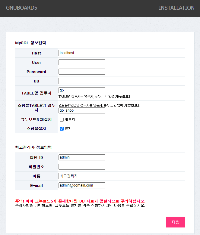 최고관리자정보는 앞으로 그누보드를 접속하여 게시판을 관리할때 사용하는 정보이므로