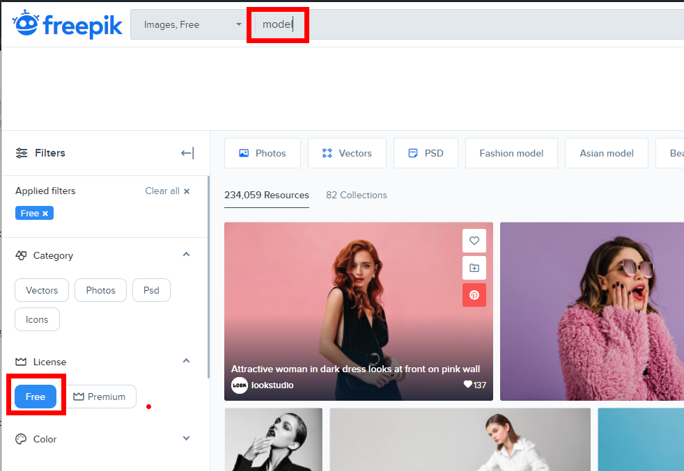 이미지 검색 시 무료 다운로드 가능한 이미지만 보일 수 있도록 좌측 Free를 선택하고 이미지를 확인합니다.