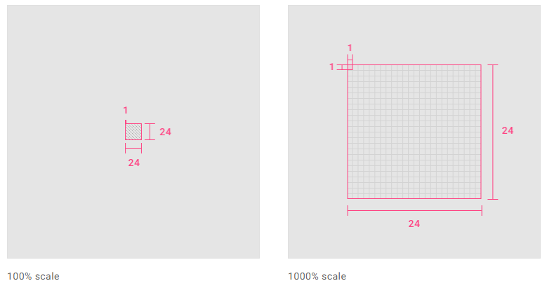 24x24px의 1 Grid를 활용하여 아이콘을 작업하는 예시를 제시해준다.
