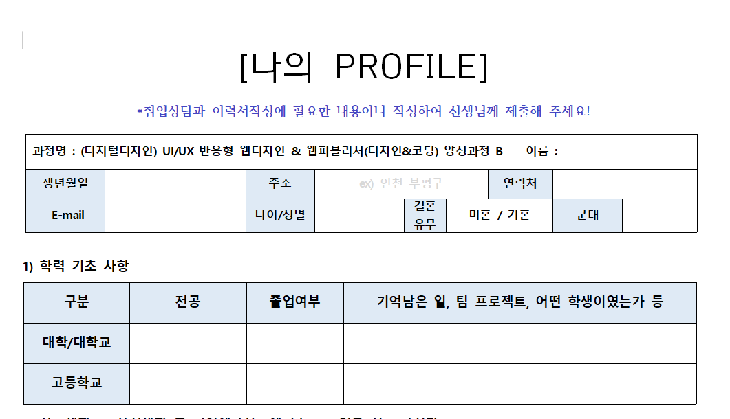 이름/생년월일/주소/연락처/E-mail/나이/성별/결혼유무/군대 정보 작성