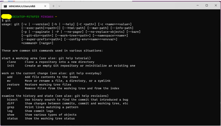$git 입력 후 사용할 수 있는 여러 입력이 표시된다면 깃 설치 완료입니다!! 축하합니다.