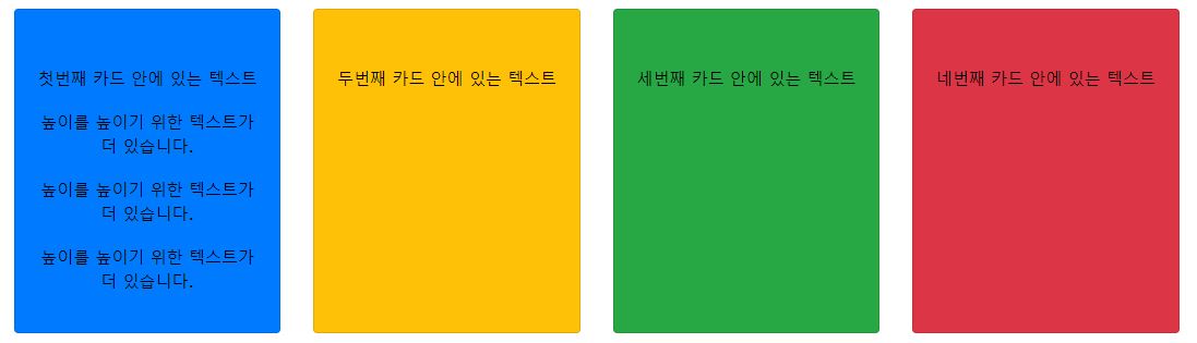 card 클래스를 묶는 부모 요소에 card-columns 클래스를 적용하여 수평으로 된 카드 열을 생성합니다. 내용 길이에 따라 크기가 달라질 수 있습니다.