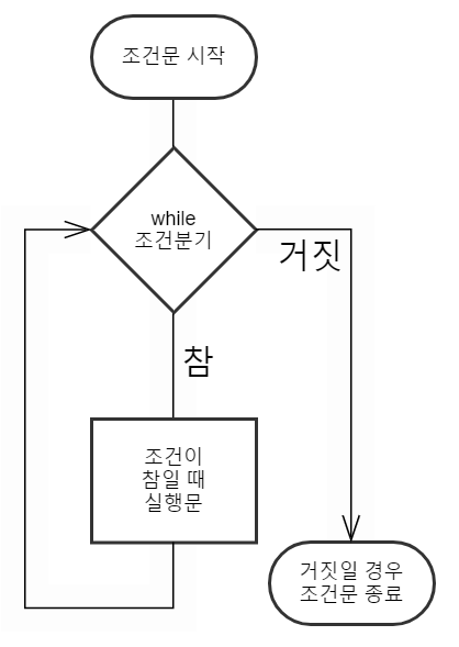 - 참이면 반복문을 실행, 거짓이면 반복문을 종료한다.