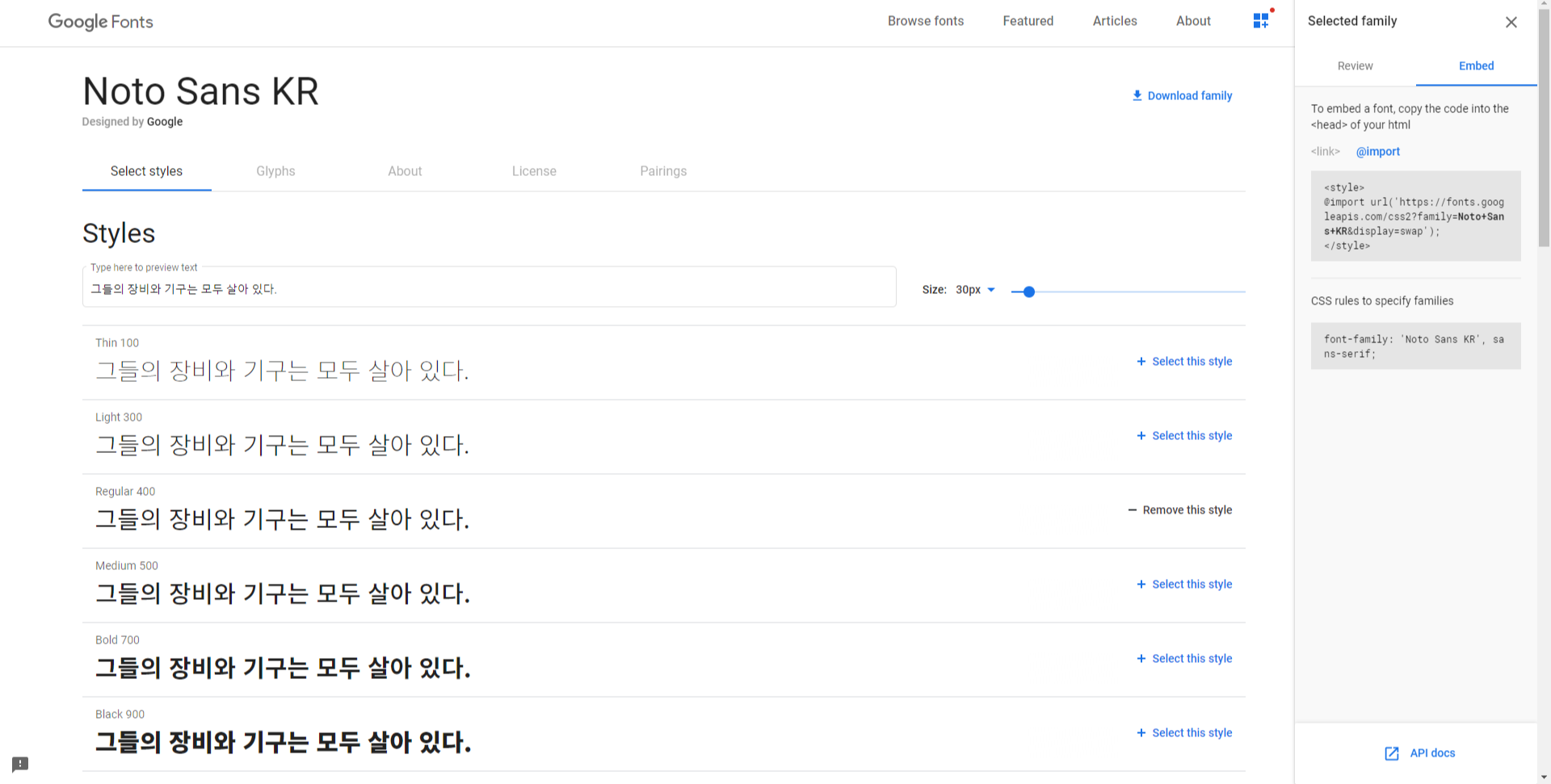2. 글꼴의 원하는 Styles 정보(굵기 차이 Light, Regular, Bold 등..) 2개 이상 선택합니다.(우측 + Select this Style)