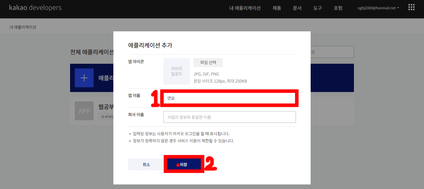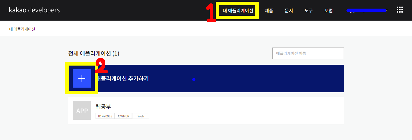 2. 개발자 등록 및 앱 생성(카카오 아이디로 등록하면 간편히 이용할 수 있습니다)